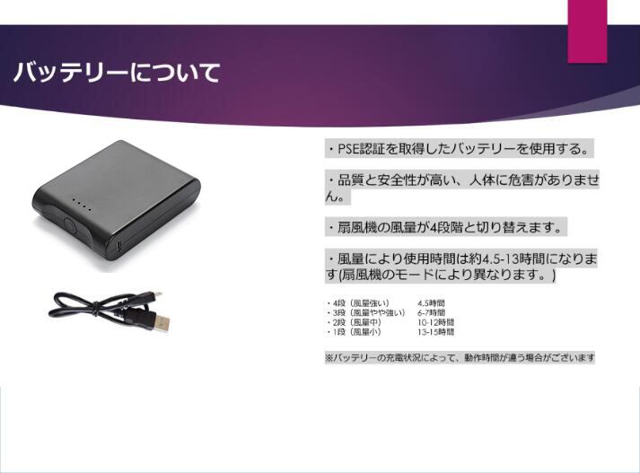 電池使用環境は-20℃?55℃です。 風量切り替え:4段階